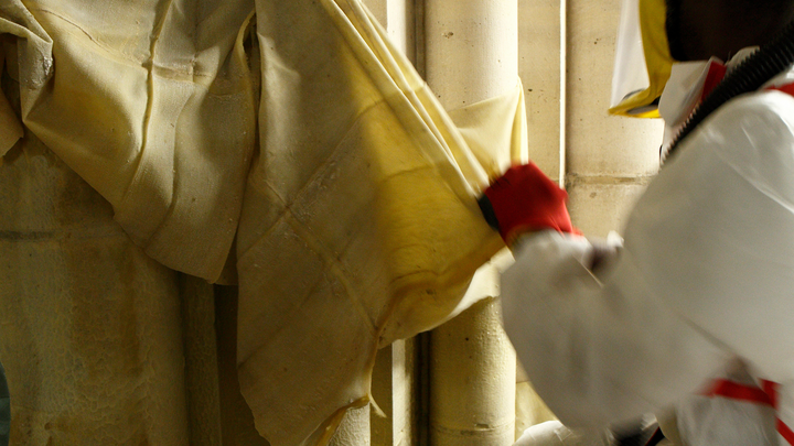 Zunächst wurden die verschmutzten Mauerwerksflächen abgesaugt und von Schmutzpartikeln befreit. Anschließend trugen die Spezialisten unter der Leitung von H. Chevalier Arte Mundit je nach Untergrund und Verschmutzungsart mit einem Pinsel oder einer Spritzpistole auf. Das lösemittelfreie Produkt funktioniert wie eine Peel-Off-Maske.