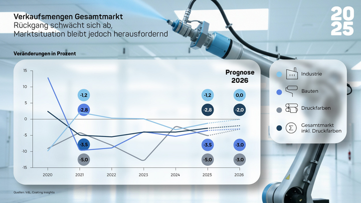 Die gesamtwirtschaftliche Schwäche belastet demnach die Lack- und Druckfarbenindustrie weiterhin erheblich, und auch für 2026 rechnen die Farbenhersteller mit einer angespannten Marktsituation: Der Verband erwartet weiter schlechte Geschäftszahlen und prognostiziert für den Gesamtmarkt einen Rückgang der Verkaufsmengen um 2 %.