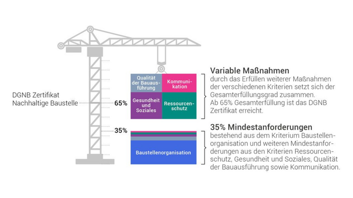 Ein Schwerpunkt der Weiterentwicklung liegt in der stärkeren Ausrichtung an regulatorischen Anforderungen wie der EU-Taxonomie. Die Grundstruktur des Systems bleibt bestehen: Bewertet werden Baustellenorganisation, Ressourcenschutz, Gesundheit und Soziales, Kommunikation sowie die Qualität der Bauausführung. Ein Zertifikat erhalten Projekte ab einem Erfüllungsgrad von 65 %, wobei bestimmte Mindestanforderungen verpflichtend sind.